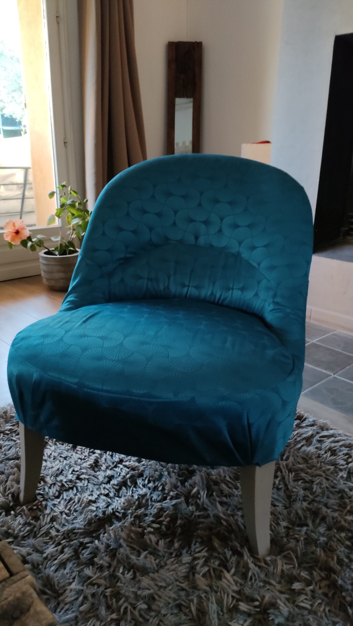 retapissé en tissu bleu canard satiné à motifs japonais.