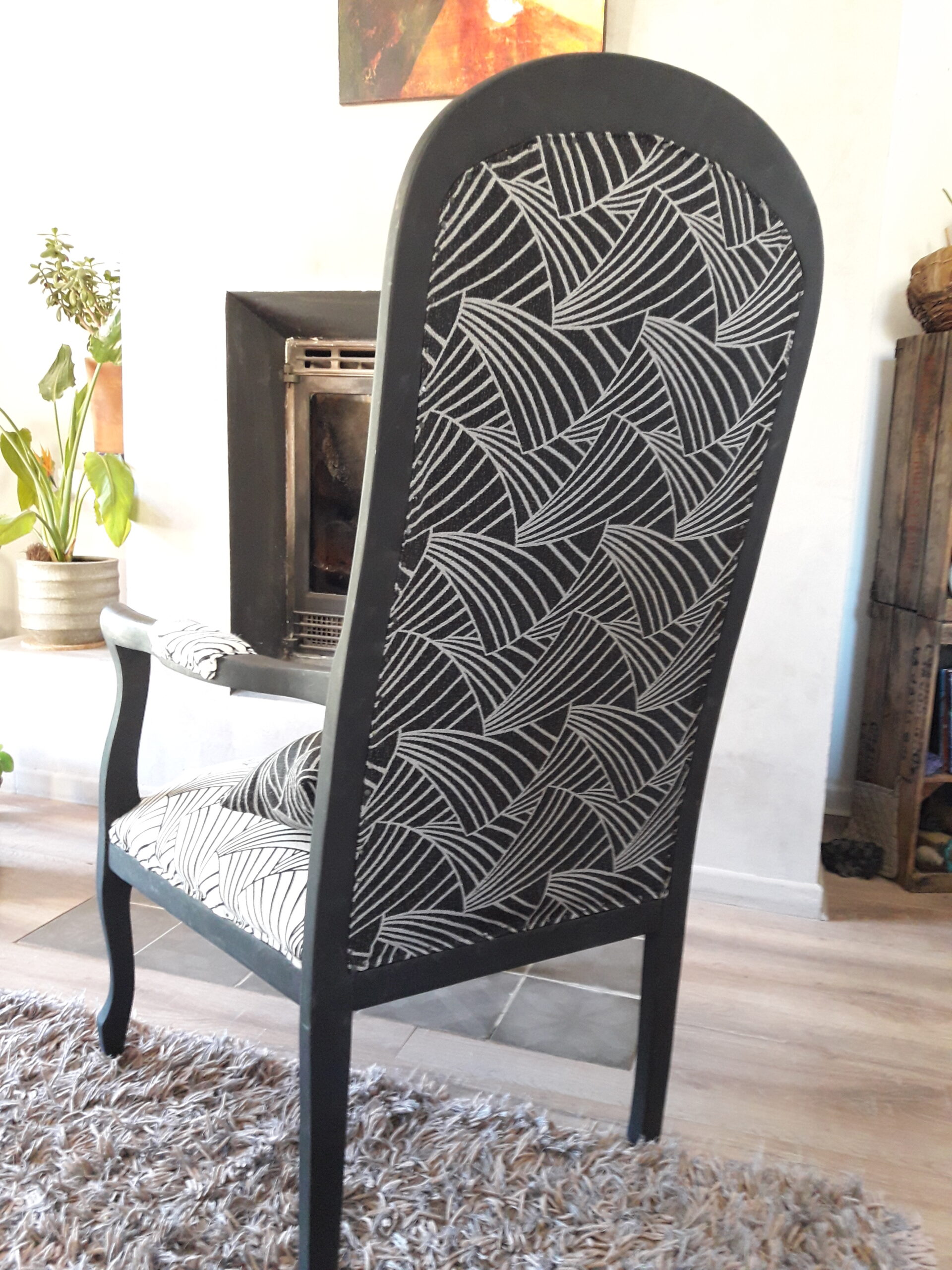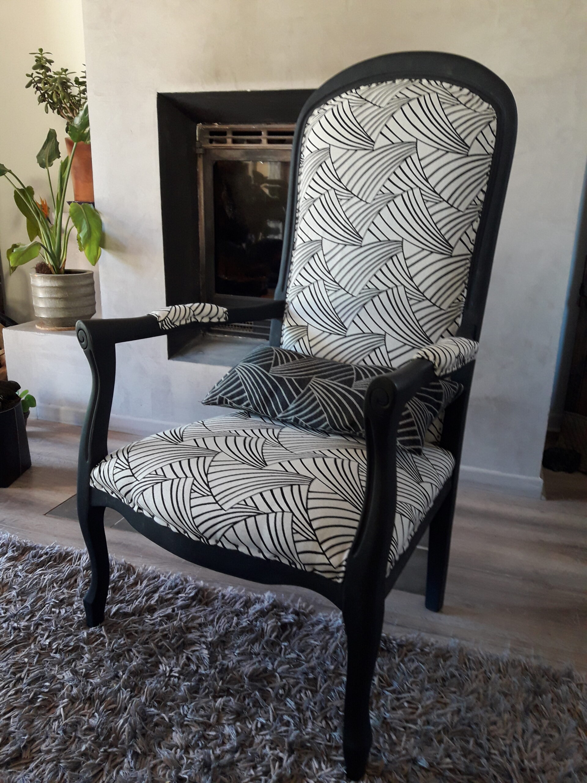 Ce fauteuil voltaire à été retapissé avec un tissu épais aux faces inversables,