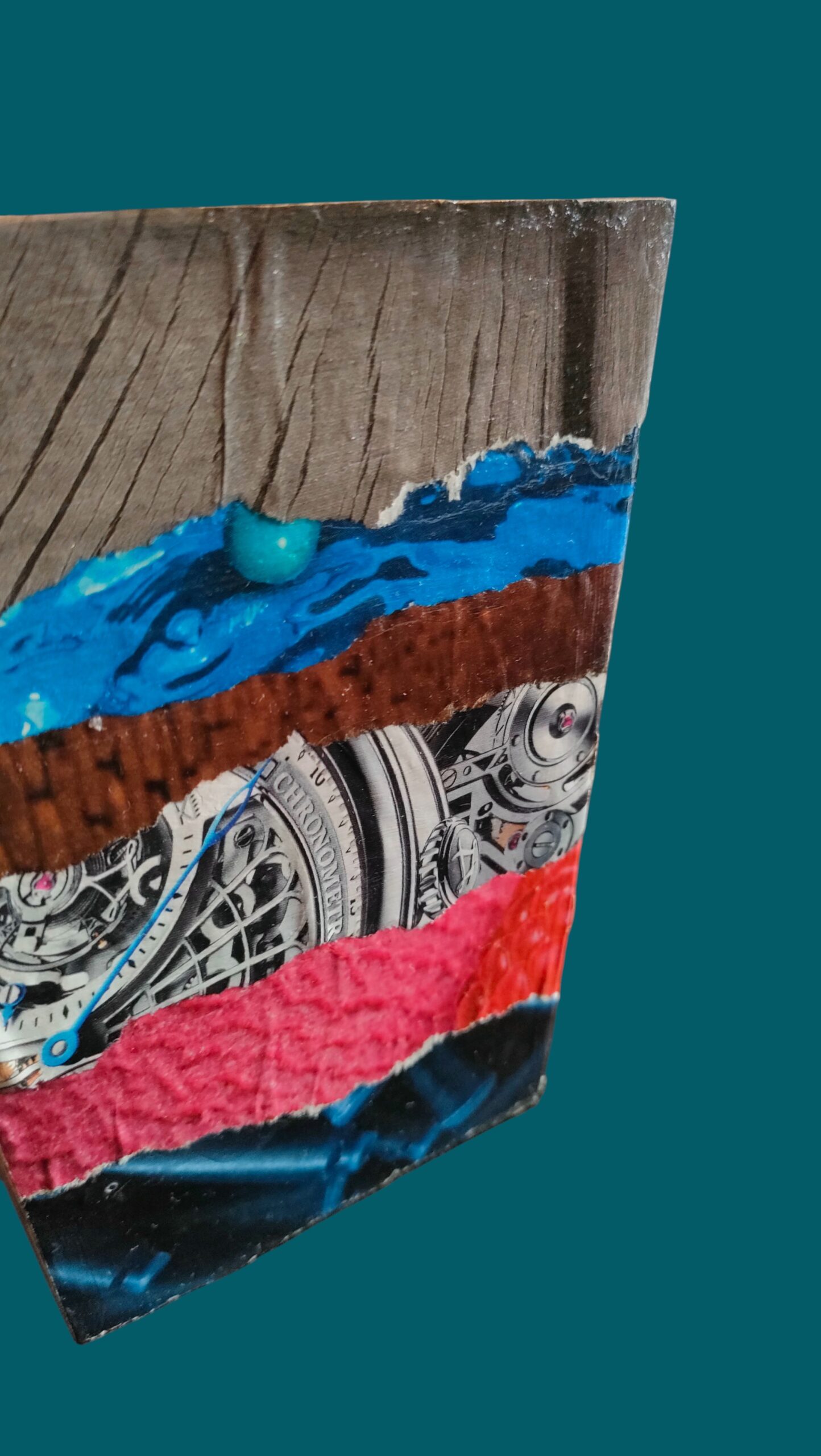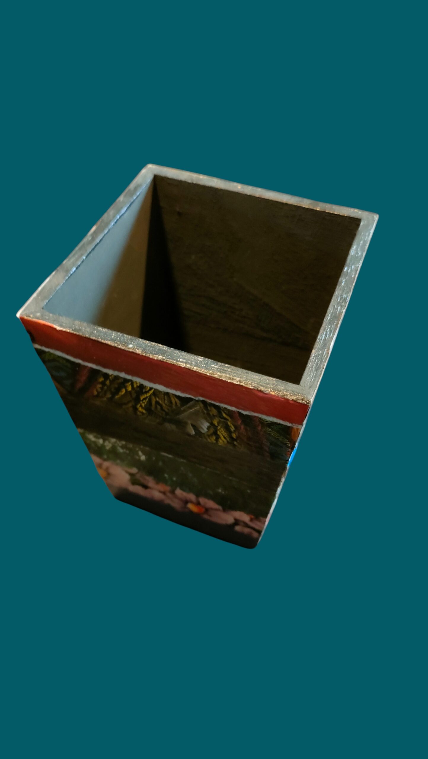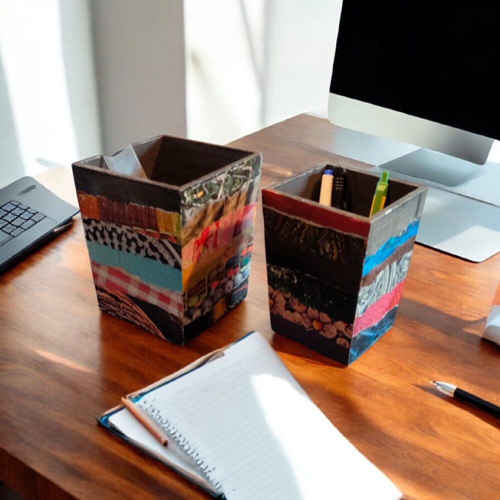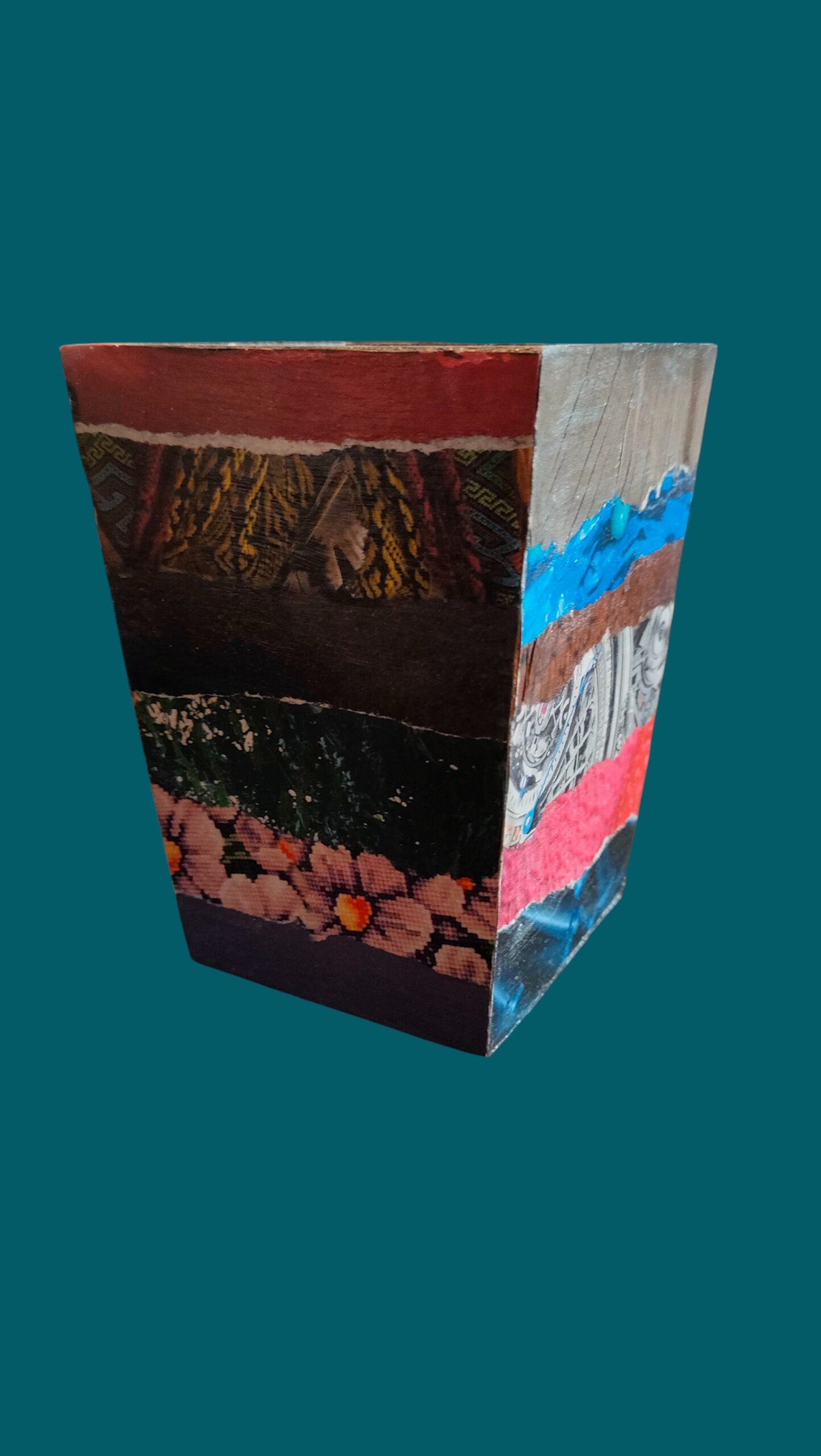 Pot en bois peint en noir, très joyeux avec une déco multicolore en collage de papiers.
