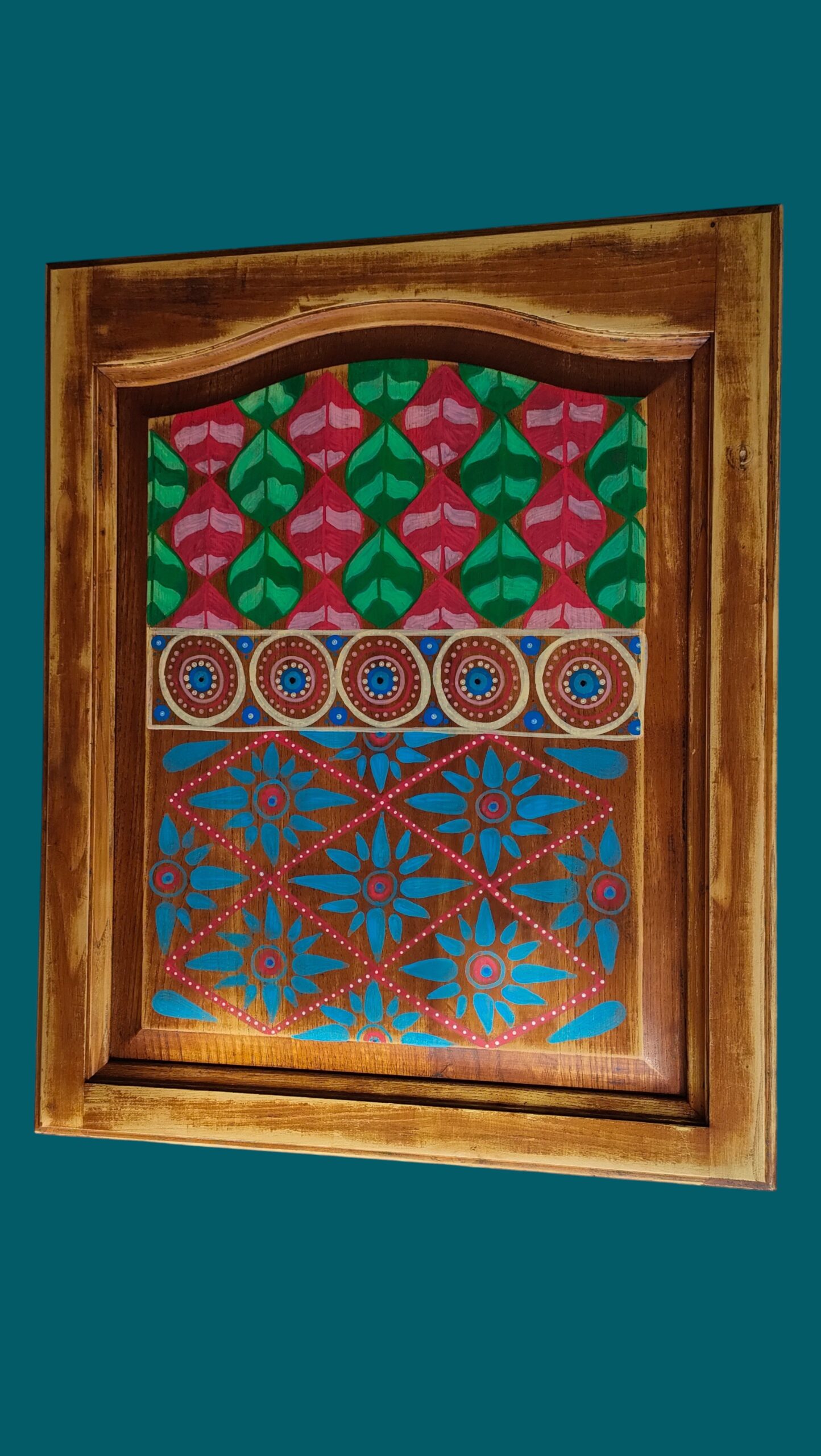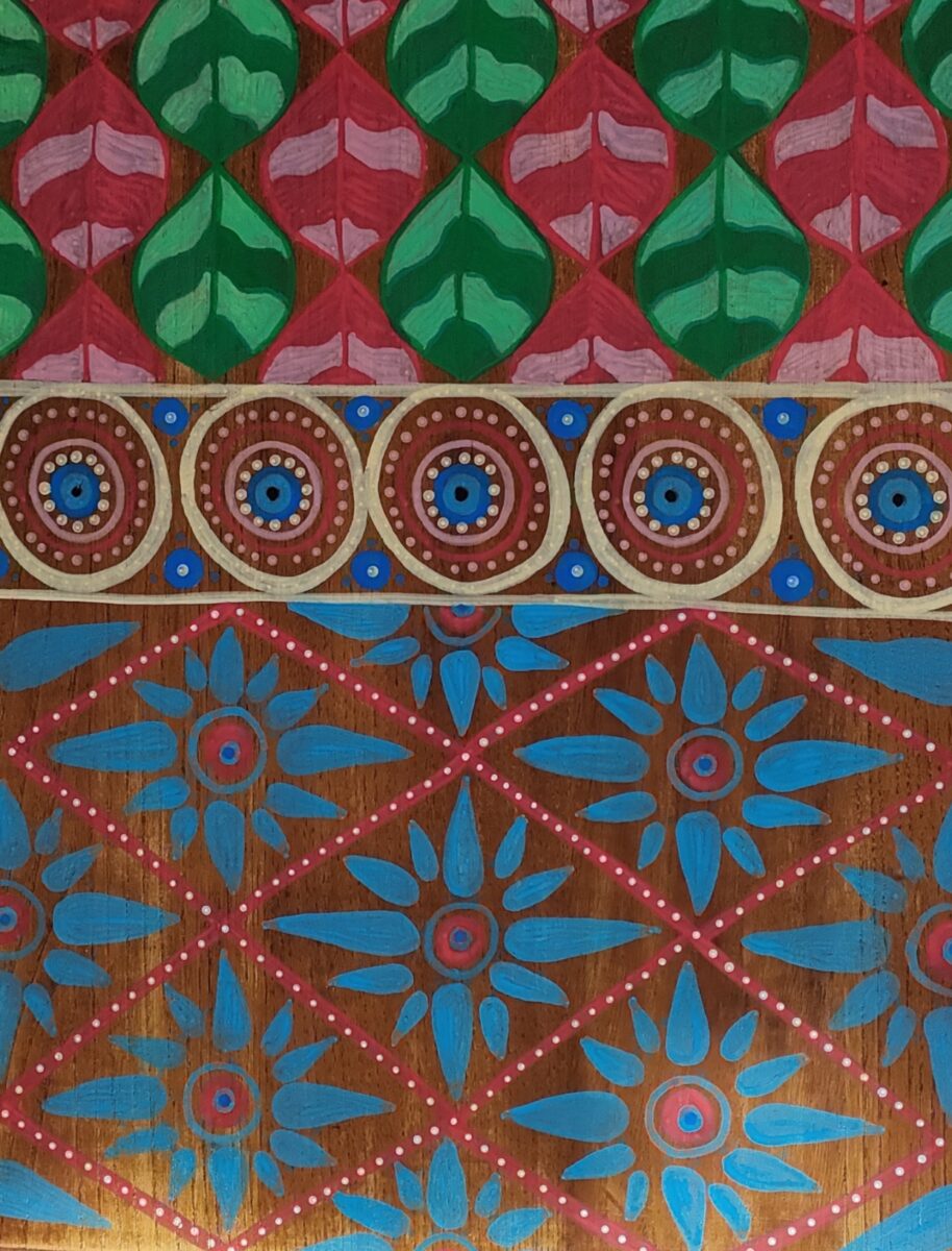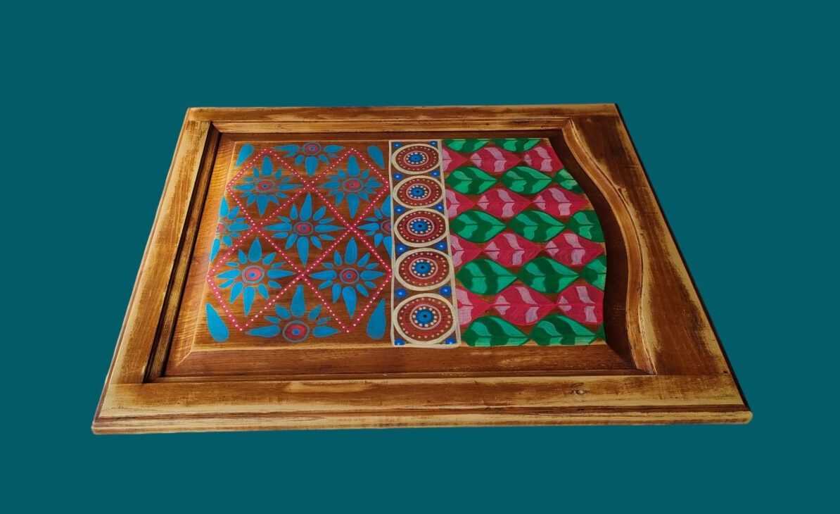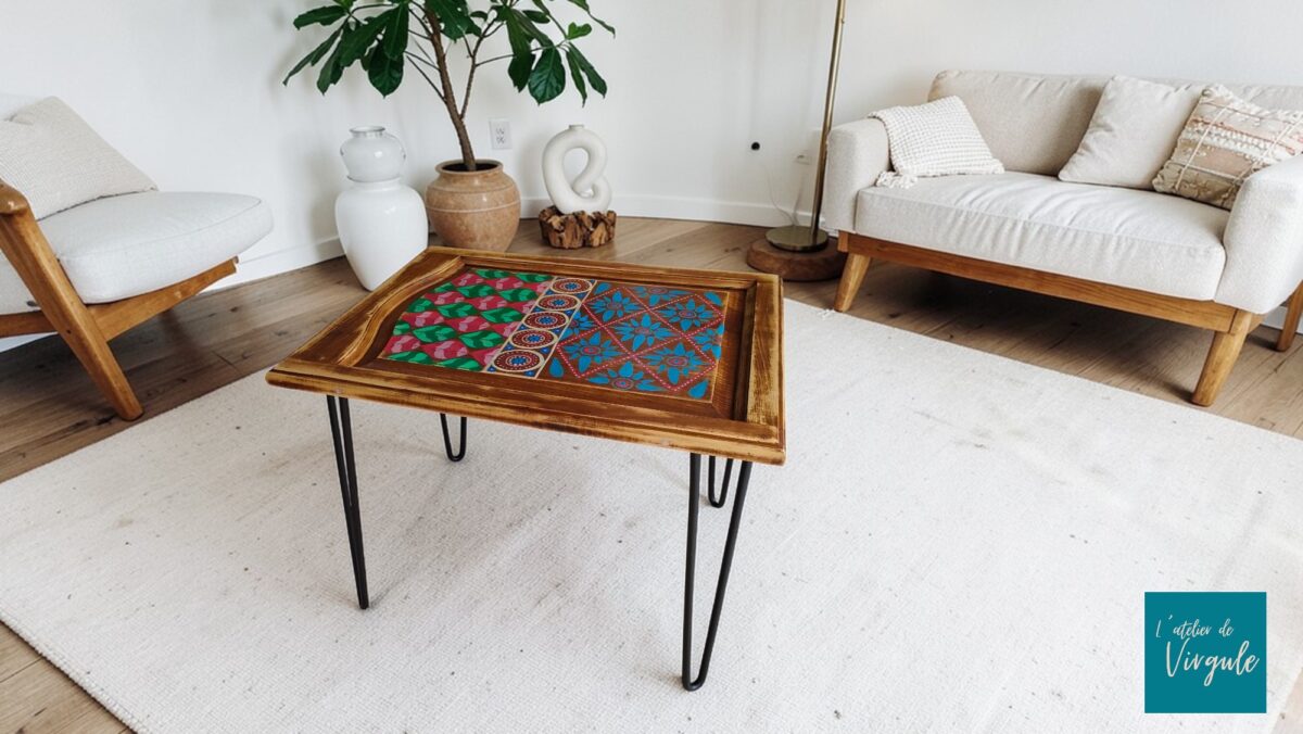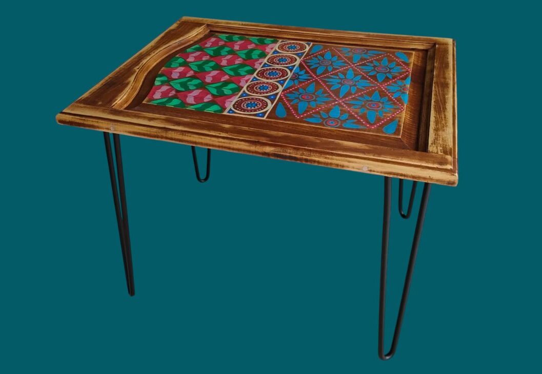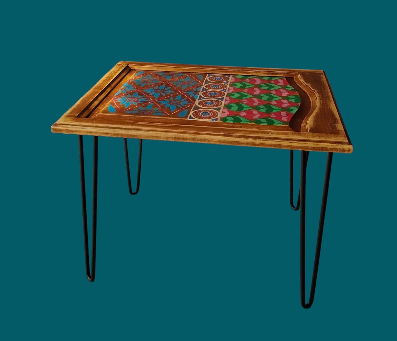 Cette table basse est le fruit d’un surcyclage créatif : une ancienne porte de cuisine en chêne massif, métamorphosée en table basse avec une décoration de style bohème-chic, peinte à la main.